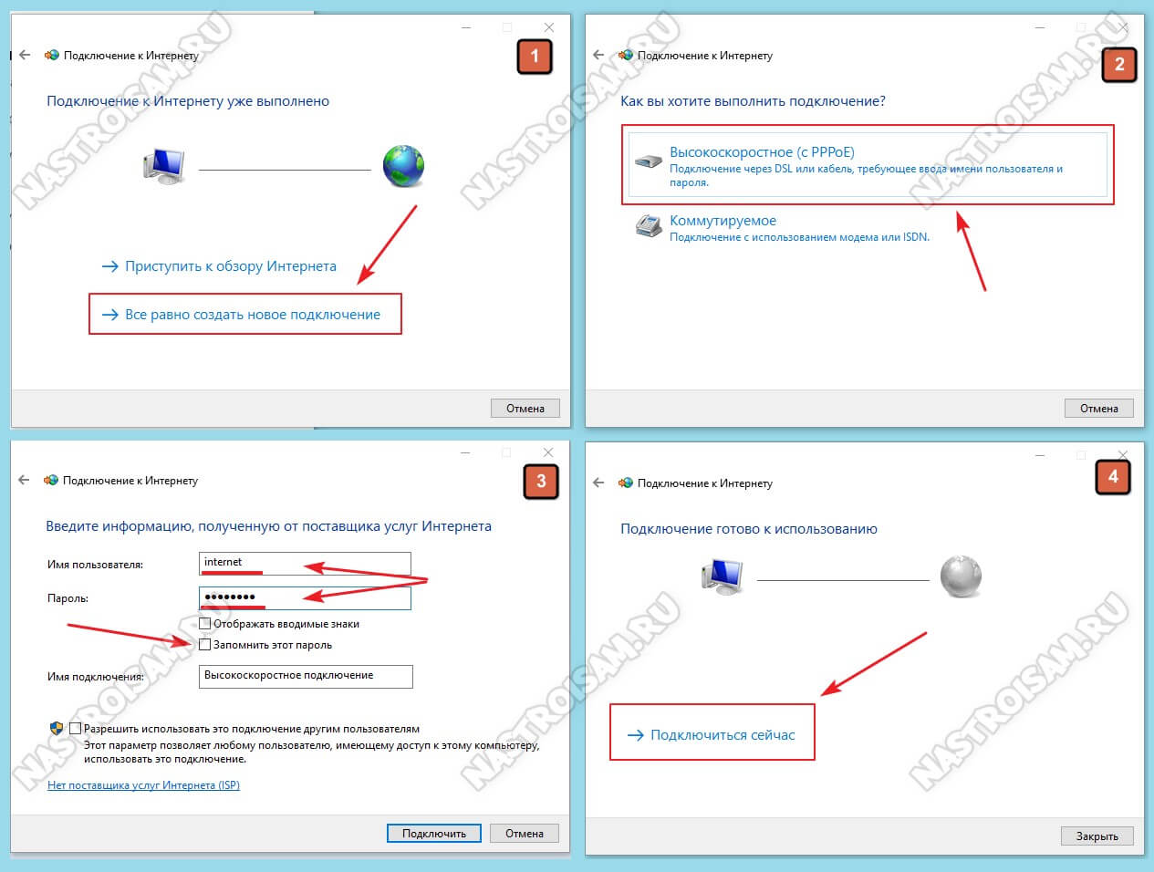 Внимание! Обязательно поставьте галочку «Запомнить этот пароль», иначе при подключении система будет постоянно требовать его ввести заново. После того, как подключение к Интернету без роутера будет создано, его надо будет запускать каждый раз, когда нужно выйти в глобальную паутину