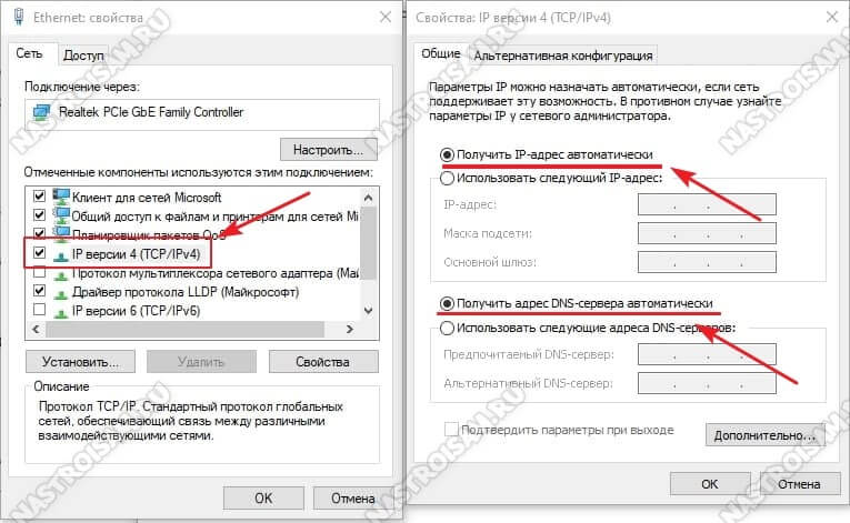 В списке компонентов найдите строчку IP версии 4 (TCP/IPv4) и дважды кликните по ней мышкой. Появится окно свойств протокола, гда надо будет проверить чтобы стояли галочки «Получить IP-адрес автоматически» и «Получить адрес DNS-сервера автоматически». Нажимаем на кнопку ОК, чтобы настройки сохранились. Можно проверять доступ в Интернет.
