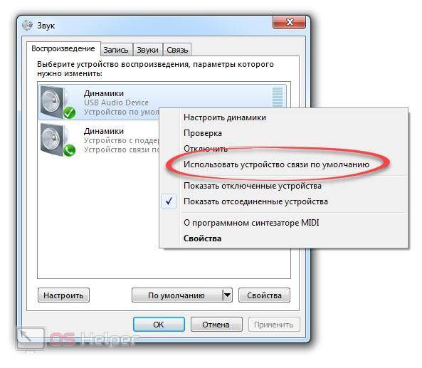 - Во вкладке «Воспроизведение» выбираем наши наушники и делаем правый клик по ним. Нам нужно выбрать девайс в качестве воспроизводящего устройства по умолчанию. Для этого жмем отмеченный пункт в контекстном меню.
