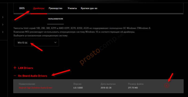 И загружаем Audio Drivers. В моем случае это Realtek High Definition Audio Driver.