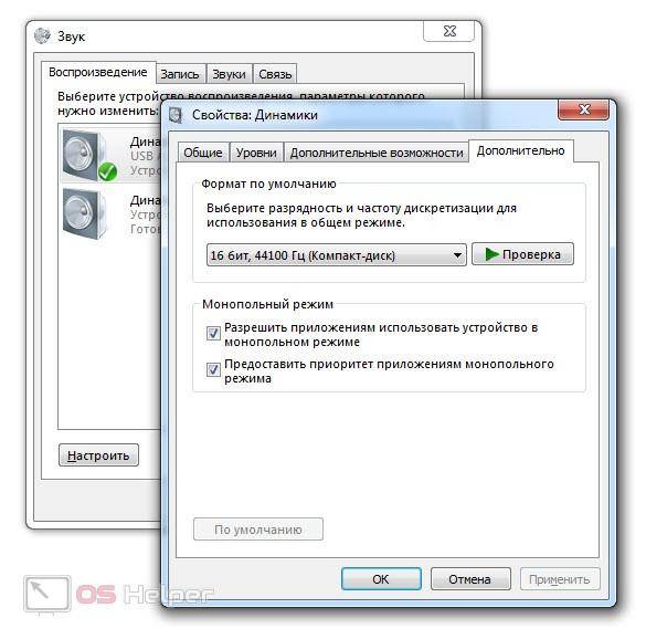 Блок «Монопольный режим» не трогаем, но если в вашей программе нет звука после того, как запускается какая-то другая программа, то уберите обе галочки.