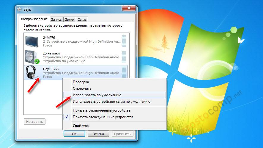 Дважды кликните на появившиеся наушники и нажмите кнопку «По умолчанию». Эта настройка переключит на них звук, как только будут подключены.