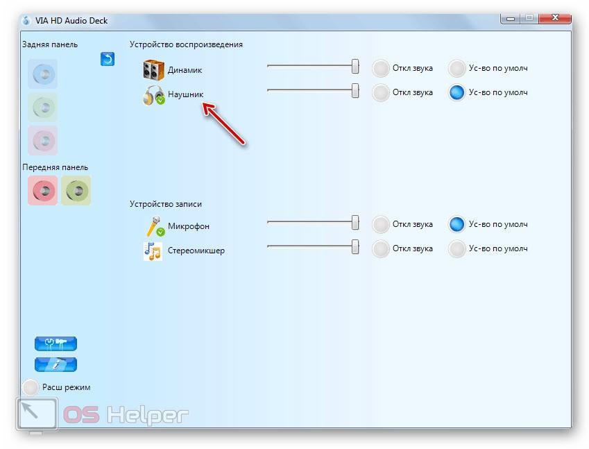 Также мы можем настроить наушники на Windows 7 при помощи поставляемого вместе со звуковой картой программного обеспечения. Оно бывает разным и зависит от модели материнской платы. В нашем случае пример построен на базе модели от VIA. Работать с нею нужно так: