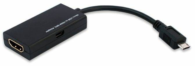 MHL – переходник с USB на HDMI, позволяющий не только транслировать изображение высокой чёткости, но и одновременно заряжать планшет. Адаптер стоит ненамного дороже шнура, поэтому такой MHL-подключение можно отнести к бюджетным.