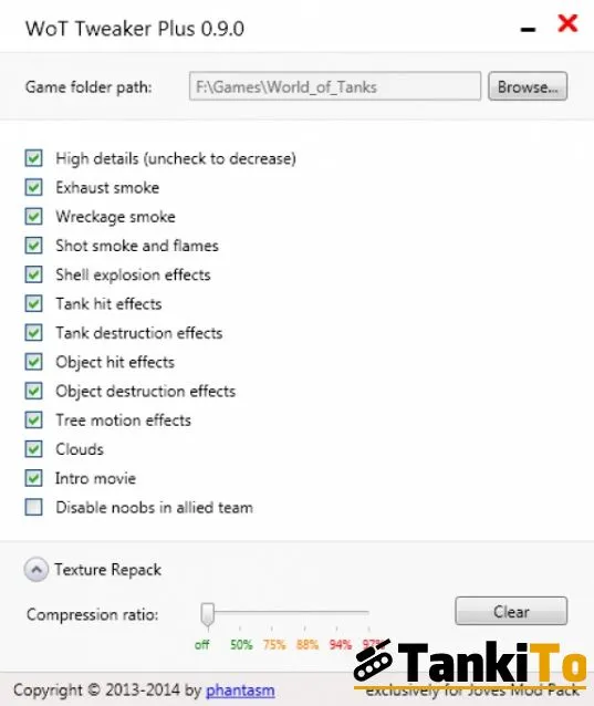 - WOTTweaker – программа, созданная специально для World of Tanks. Она позволяет отключать все ненужные спецэффекты – облака, взрывы, дым, огонь и многое другое. Значительно увеличивается FPS на слабых компьютерах. Подробнее об этой программе можно узнать на форуме разработчика.