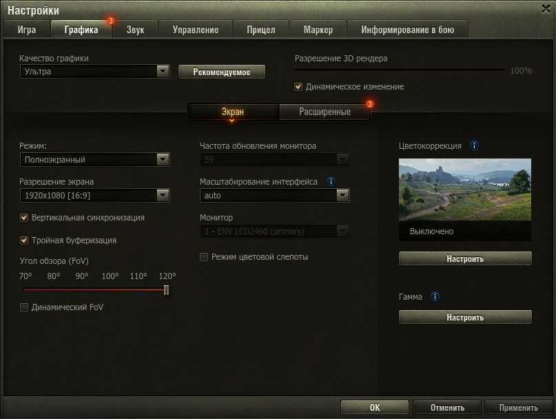 Остальные параметры, такие как: монитор, режим дальтонизма, цветокоррекция и гамма, которые находятся в окне «Дисплей» в настройках графики, никак не влияют на производительность World of Tanks.