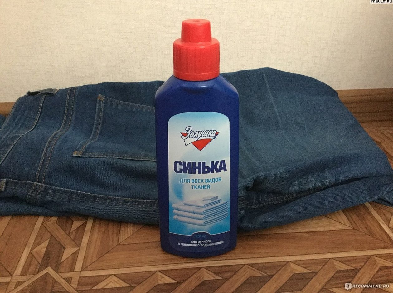 Синька — вещество, в составе которого есть крахмал и синий краситель. Она является безопасной для кожи и лёгкой в использовании. Кроме того, это самый бюджетный способ покрасить джинсы в синий цвет. Главный недостаток способа – необходима максимальная аккуратность, иначе синим станет всё вокруг. Ещё одним минусом часто называют нестойкий результат, однако пятна, оставшиеся от неразбалвенной синьки на хлопке не выводятся до конца долгое и долгое время. Наконец, третье слабое место синьки – после окрашивания вещи линяют, поэтому стирать их нужно будет отдельно.