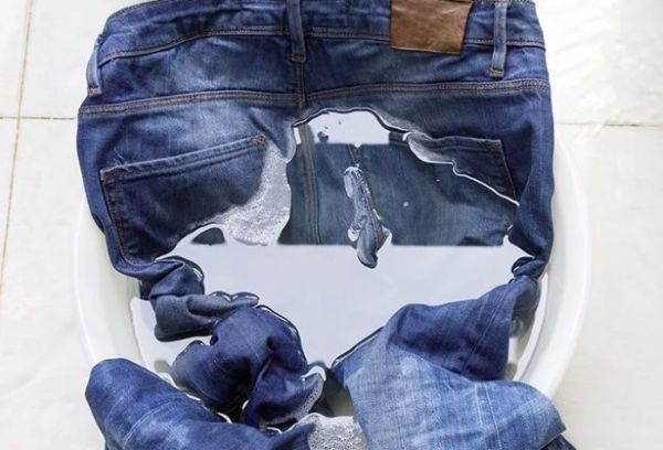 - В этом растворе пускай брючки отмокают 25 минут. После этого выстирайте их в машинке обычным для джинсов способом: минимальный срок, а температура не более 40 градусов.