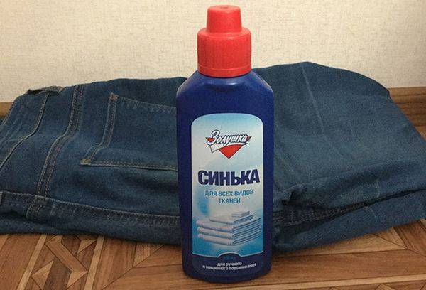 Дешево и сердито вернуть синим вылинявшим джинсам цвет можно, воспользовавшись синькой. Количество красителя рассчитывается в зависимости от желаемого оттенка. Средство разводится в теплой соленой воде. В получившемся растворе джинсы замачивают на несколько часов, иногда их «помешивая» и переворачивая, чтобы получить ровный цвет. В конце штаны полощут в слабом уксусном растворе.