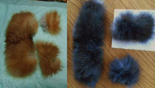 Длинноворсный мех (песец, лиса) лучше подкрашивать в естественный цвет, подбирая краску по цвету. При покраске в тёмные тона, да ещё когда новые шкуры, краски уходит в разы больше.