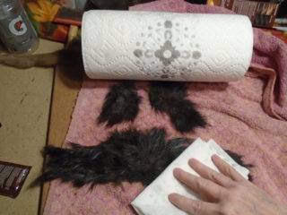 - После отжимания причешите мех расчёской и положите сушить на плоской поверхности в расправленном виде мездрой вверх, придав нужную форму.