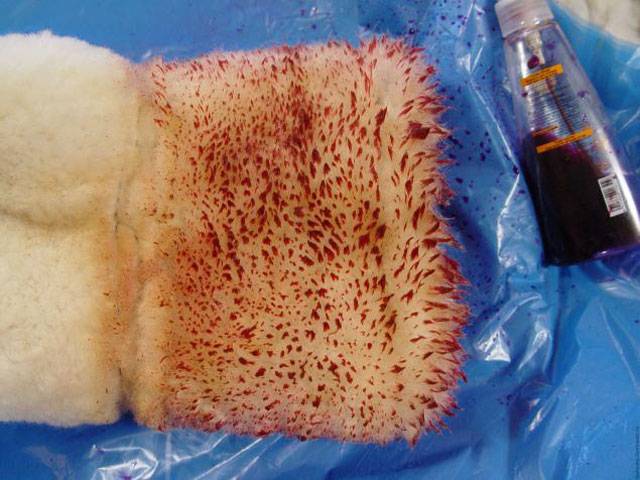 - Покрасить шубу рыжего цвета получится марганцевым раствором. Он должен быть концентрированным. Наносят раствор новой губкой для посуды и следят, чтобы кожа не намочилась.