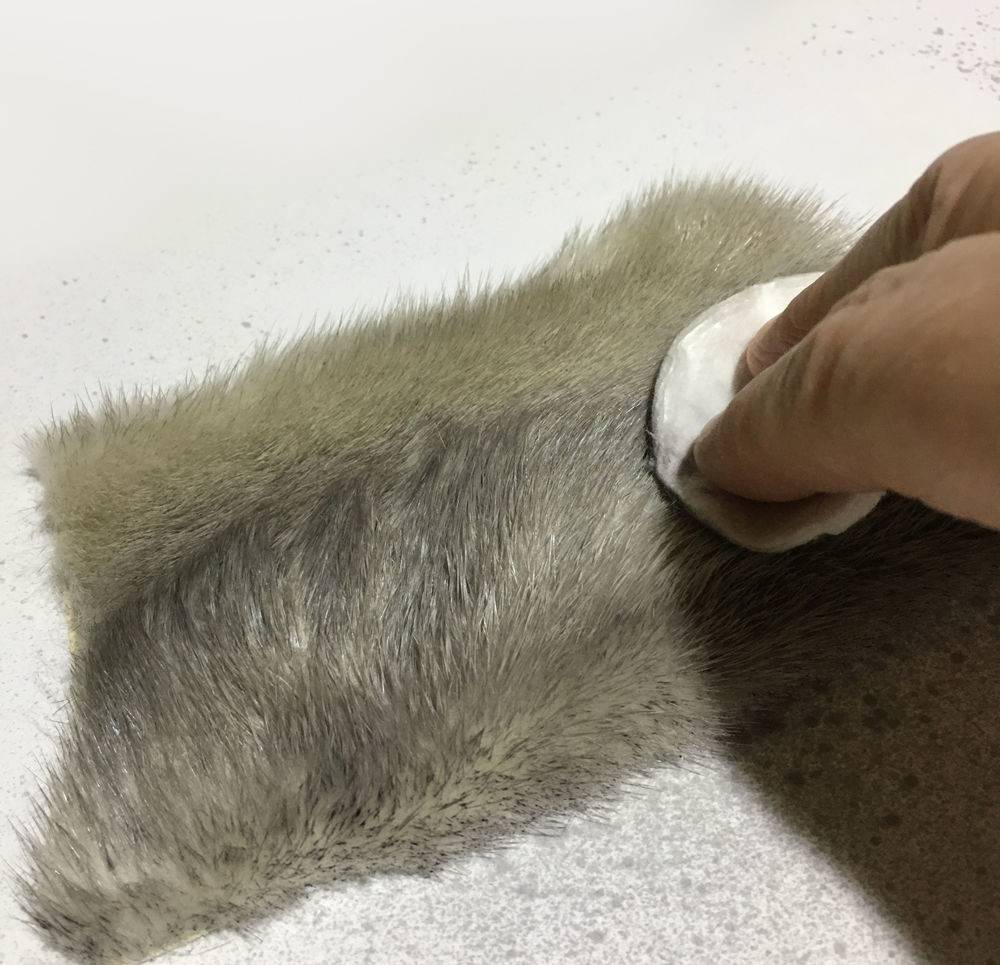 - Наносят на изделие равномерными, быстрыми движениями. Растирают по всему меху – пятен не должно остаться. Движения должны быть осторожными, чтобы волоски не ломались.