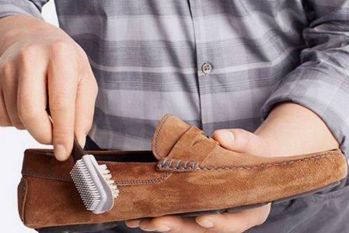 - Тщательно вымыть подошву и вычистить с поверхности изделия крупные частички грязи и пыли, используя специальную щетку для замши;