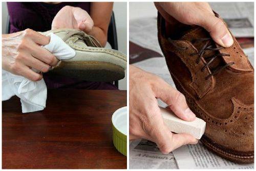 - Замшевая обувь может лосниться, и такой дефект следует устранить, так как он повлияет на результат окрашивания или будет выделяться ещё сильнее под яркой краской. Для удаления лоска можно использовать 9%-ный уксус, разбавив его двумя частями воды. Ещё одно эффективное средство – это молоко с содой. В половине стакана молока растворите пару столовых ложек пищевой соды и этой смесью обработайте все лоснящиеся участки. Также подойдёт и обычный ластик, который прекрасно справляется с лоском.