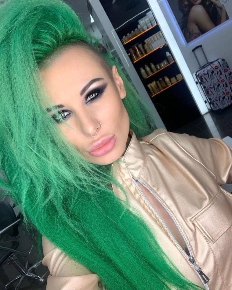 “Крэйзи Колор” несколько проще в использовании. Его можно нанести самостоятельно во время водных процедур, но именно зелёная краска для волос, как и в первом случае, требует сильного осветления, иначе цвет будет не столь ярким, а на тёмной шевелюре результат вовсе не будет заметен.