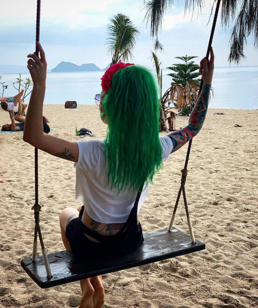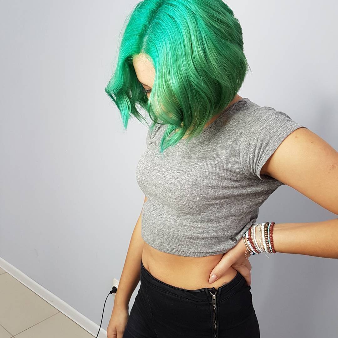 “Крэйзи Колор” несколько проще в использовании. Его можно нанести самостоятельно во время водных процедур, но именно зелёная краска для волос, как и в первом случае, требует сильного осветления, иначе цвет будет не столь ярким, а на тёмной шевелюре результат вовсе не будет заметен.