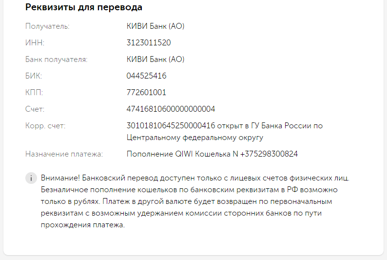 Комиссия зависит от банка. Отправьте платёж по реквизитам при помощи онлайн-банкинга либо в банковском отделении. Деньги придут в течении трех рабочих дней. Это не популярный способ пополнить киви кошелек.