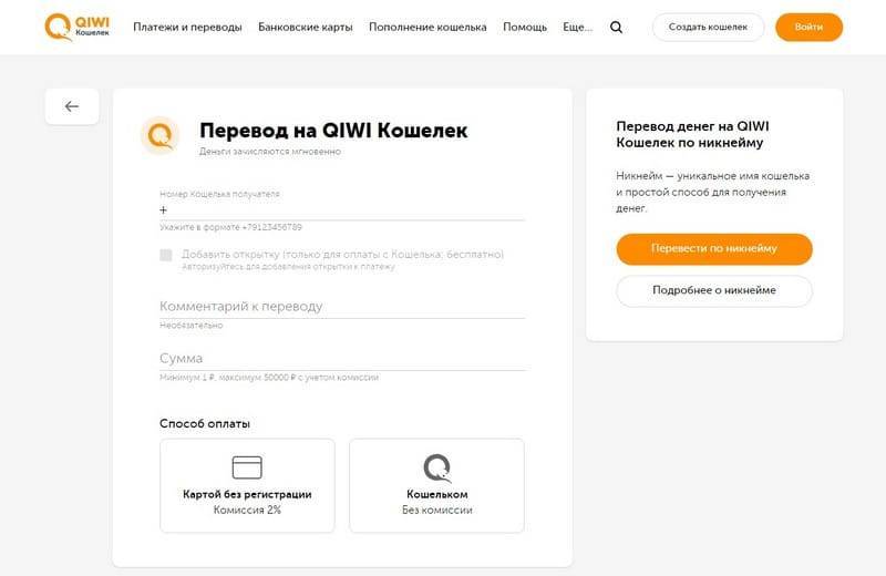 При переводах со своего QIWI кошелька комиссия не взымается, а при оплате банковской картой она составляет 2% от суммы перевода.