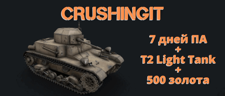 CRUSHINGIT CRUSHINGIT — Довольно скромный код, однако он пользуется популярностью у игроков. За активацию игроку полагается 7-дневный прем аккаунт, танк T2 Light и 500 голды в игровую копилку.