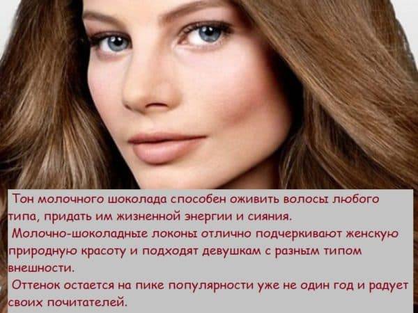 Любой тон из палитры молочного шоколада выглядит на волосах утонченно привлекательно. При помощи модного цвета можно радикально изменить образ, придать ему свежесть, яркость. Оттенок этот универсальный, подходит практически всем девушкам. По отзывам женщин, первоначальное окрашивание лучше провести в салоне – опытный мастер сможет подобрать правильную краску, даст рекомендации по уходу за локонами.