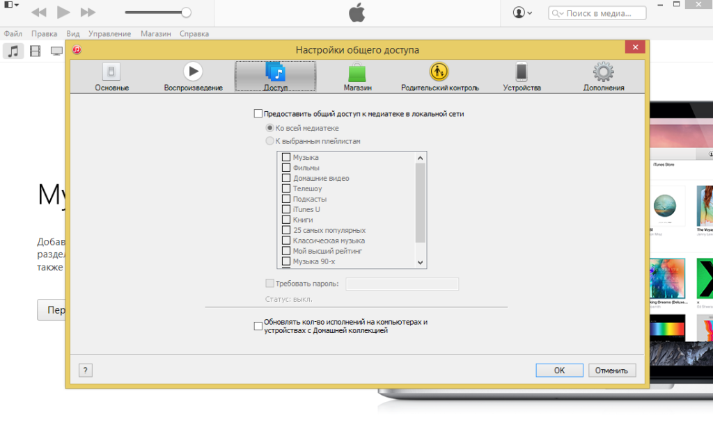 Здесь можно создать общий доступ к медиатеке в локальной сети.
