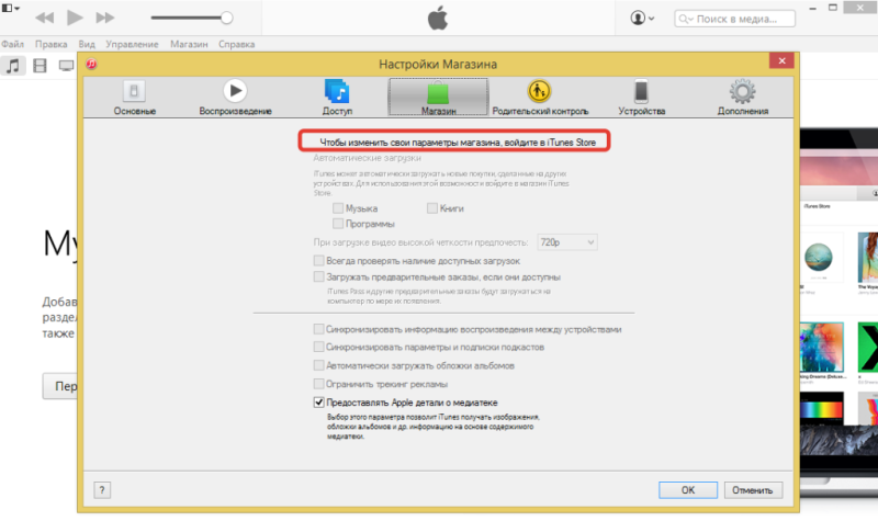 Для изменения параметров на вкладке «Магазин» сначала необходимо авторизоваться в iTunes Store.