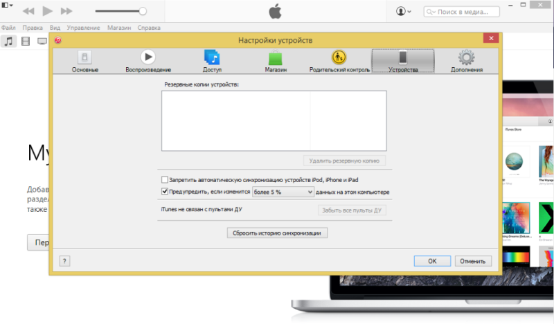 При первом запуске Айтюнс вкладка «Устройства» будет ничем не заполнена. Впоследствии здесь появятся резервные копии устройств Apple, которые можно использовать для восстановления утерянных данных.
