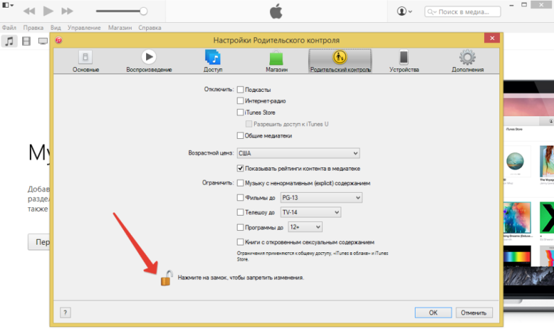 Если программой будут пользоваться дети, установите ограничения на медиаконтент, отметив соответствующие пункты в параметрах Айтюнс.
