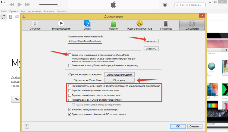 Кроме того, на вкладке «Дополнения» есть удобная функция «Сброс кэша», позволяющая удалить сведения об активности в iTunes Store.