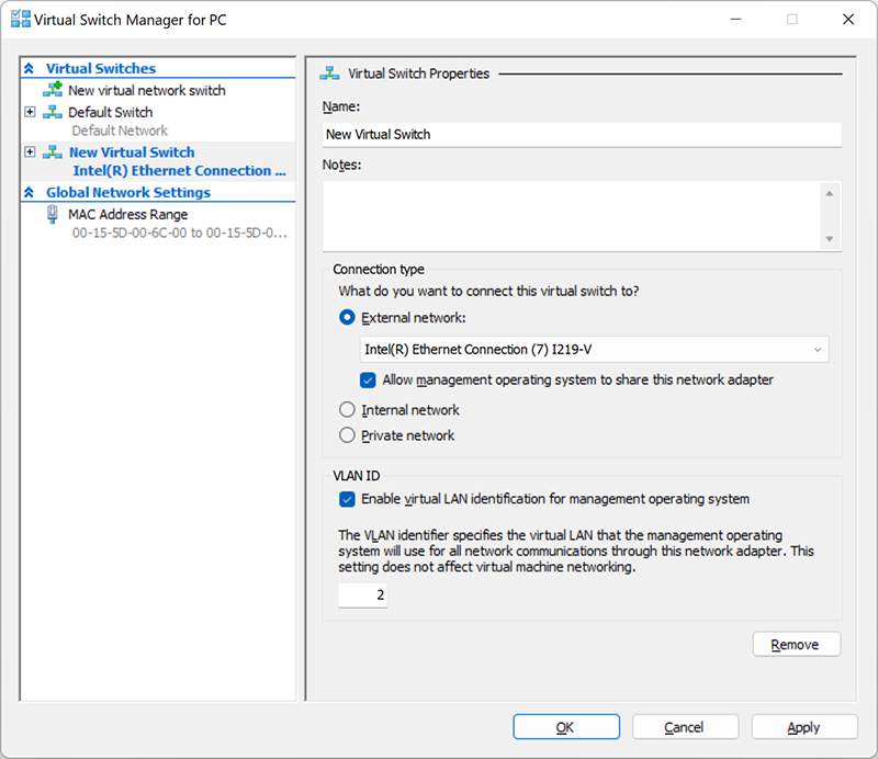 Hyper-V поддерживает работу с VLAN (IEEE 802.1Q). Вы можете вручную настроить этот идентификатор, который затем будет использоваться для сетевых соединений. Для этого в свойствах виртуальных сетевых интерфейсов поставьте галочку на «Разрешить идентификацию виртуальной локальной сети для управляющей операционной системы» (или «Enable VLAN Identification»). Эта опция доступна для внешнего и внутреннего типа сети.