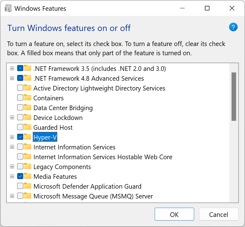 4. В диалоговом окне «Компоненты Windows» выберите «Hyper-V» и нажмите «ОК».