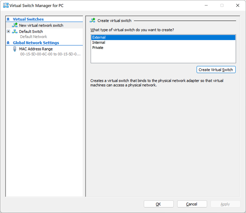 - Внешний (External): помогает создать виртуальный коммутатор, который предоставляет доступ виртуальным машинам к физической сети путем привязки к физическому сетевому адаптеру.
