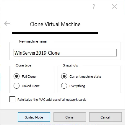 Enter the new machine name (by default the “clone” word is appended to the original VM name). Choose the clone type (full clone or linked clone), snapshot options (current machine state or everything). In the case of VM cloning, unique identifiers of the operating system and virtual disks are changed.