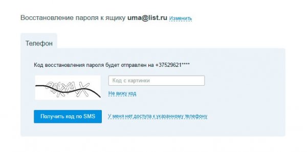 Если вы ранее прикрепляли к профилю почты номер телефона, то отобразится уведомление о том, что возможно восстановление доступа через мобильный. Введите капчу (код с картинки). Кликните кнопку «Получить код… ».