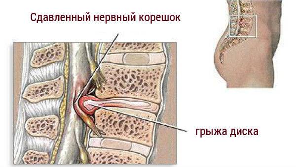- Острый радикулит при поражении диска, позвонкового сустава, или сильном мышечном спазме проявляется в виде прострелов, доходящих из спины в другие области (ягодицы, пах, нижние конечности).