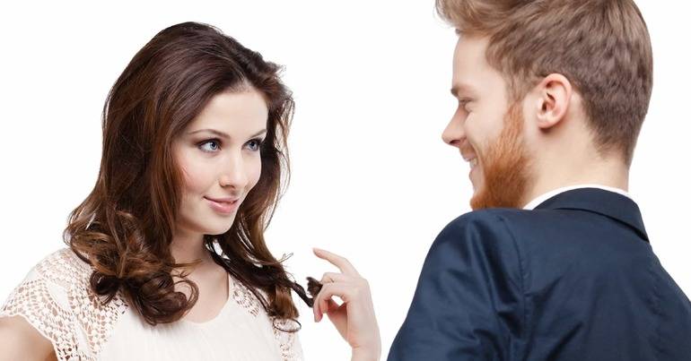 Флиртующая девушка любит играть со своими волосами. Она может кокетливо поглаживать волосы, откидывать их назад, демонстрируя шею и грудь, поправлять челку, накручивать локон на палец или карандаш, если дело происходит в школе.