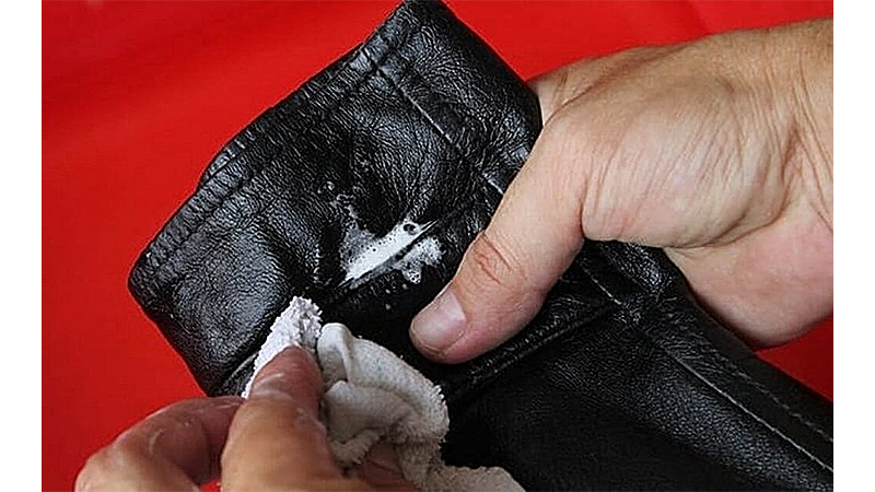 Общую чистку кожаной куртки можно проводить мыльным раствором. Разведите в воде небольшое количество жидкого мыла, смочите губку и протрите изделие. Если на куртке есть легкие загрязнения, добавьте в мыльный раствор нашатырный спирт (1 ч. л. на 1 л воды). Смойте остатки средства чистой водой и насухо протрите кожу. В завершении смажьте изделие глицерином или специальным кремом и отполируйте мягкой сухой тканью.