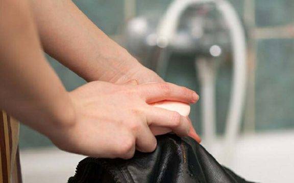 - Перед непосредственной стиркой в стиральной машине кожаное изделие рекомендуется очистить с помощью мягкой тряпочки и жидкого мыла (средства для мытья посуды) от лёгких загрязнений, пыли и пятен. А вот обыкновенные губки для посуды лучше не использовать – они имеют жёсткую и шершавую основу, которая лишь навредит коже.