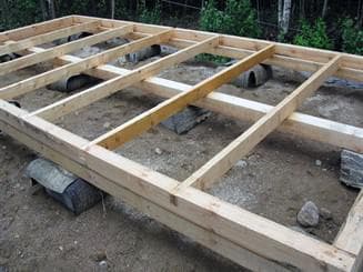 С боковых сторон к ним прибивают бруски, куда укладывают доски чернового пола и теплоизоляцию с гидробарьером.
