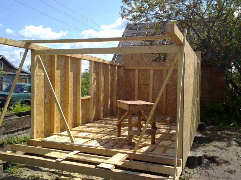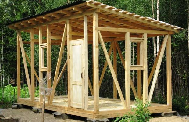Многие пользуются этим методом как самым простейшим. Щитовая вариация состоит из рам, в основе которых доски. Сборка рам осуществляется на земле. Затем производится их сбивка в короб. После настилки пола выполняется обшивка стен. Для этой цели подходит любой имеющийся материал – листы ДСП или ОSB, фанера и так далее. Затем следует установка дверей. Существенный минус: конструкция прослужит не более одного сезона. В ней отсутствуют несущие элементы, поэтому строение быстро перекосится за счет нагрузки еще до морозов. Это неплохой вариант для сезонной времянки.