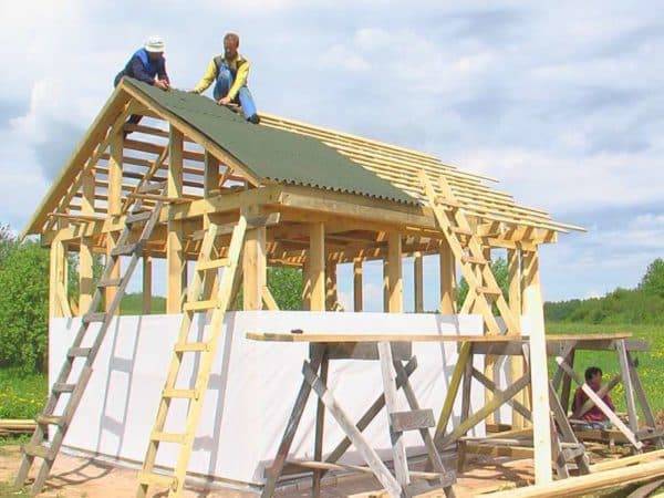 Гидроизоляция и укладка кровельного материала выполняется согласно инструкции для односкатной крыши. Единственное, если бытовка будет зимней, желательно утеплить не только перекрытия потолка, но и саму крышу. Эта операция осуществляется по тому же принципу, что и утепление каркасных стен.