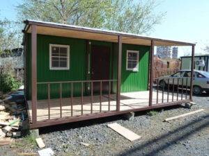 При этом целесообразнее использовать саморезы, нежели гвозди. Лишний раз напоминаем про пароизоляцию и утеплительный материал. Зашиваем бытовку снаружи, шпаклюем при необходимости и вуаля! Бытовка готова, а вы сэкономили кучу времени и денежных средств, которые уж точно пригодятся для главной стройки. При наличии задатков эстета можно ещё потрудиться над созданием привлекательного крыльца.