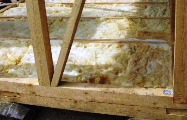 - Между вертикальными брусьями помещают плиты утеплителя. Для этих целей рекомендуется использовать базальтовую вату. Изнутри теплоизоляцию закрывают пароизоляционным материалом, прибивая его рейками к стойкам.