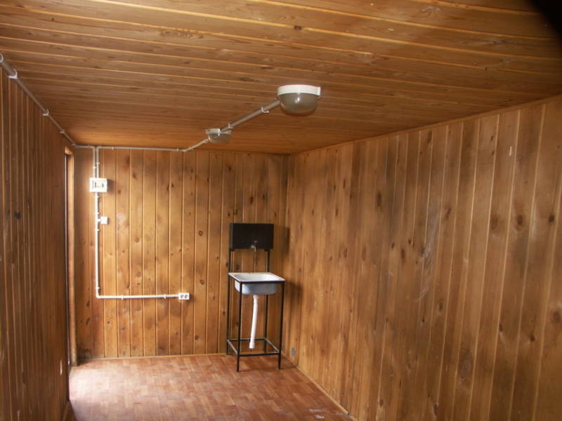Внутри бытовка облагораживается любым имеющимся материалом (фанерой, ламинатом и так далее). Именно перед внутренними работами проводится прокладка электросетей (кабелей в гофре), а также выполняется утепление по аналогии с полом.