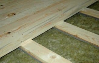 Затем приступают к устройству половых лаг, для чего монтируют доски, поставленные ребром с шагом 50 или 60 см, что определяется шириной выбранной теплоизоляции.