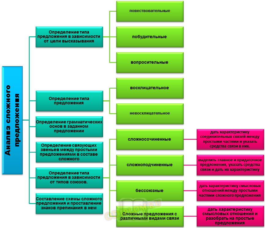 Следующим шагом становится определение грамматических основ в заданном предложении и определение связующих звеньев между простыми предложениями в составе сложного. Обязательно определяется тип предложения в зависимости от типов союзов. Для сложных предложений с различными видами связи нужно дать характеристику смысловых отношений и разобрать на простые предложения. В завершение составляется схема сложного предложения. Полный порядок разбора сложного предложения представлен на схеме ниже.