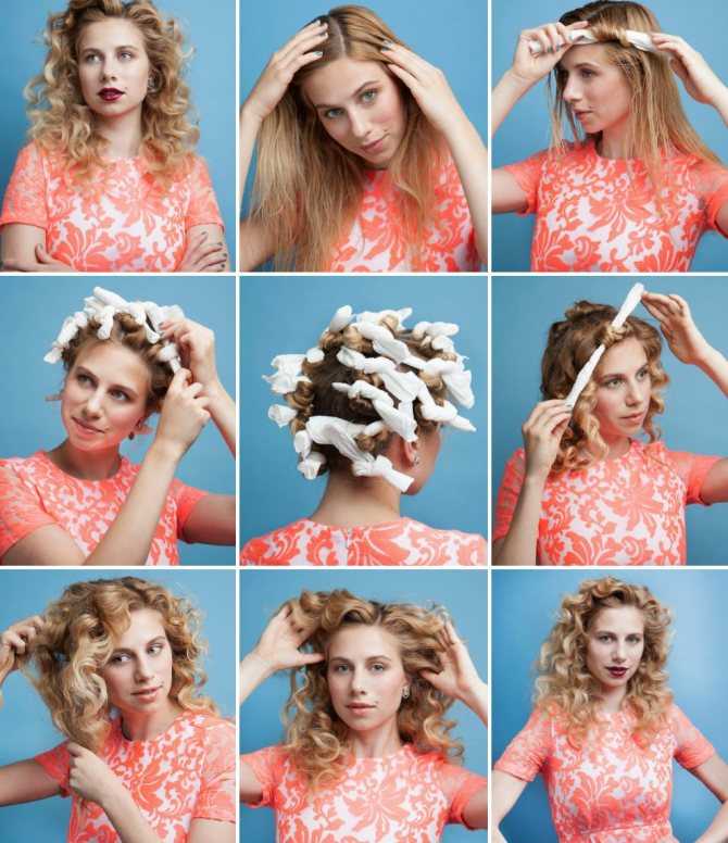 Вместо тряпочек многие используют влажные салфетки, носки или колготки, в зависимости от того, что есть под рукой. Можно также использовать бумажные трубочки. На фото показан пошаговый процесс создания крупных кудрей с помощью салфеток:
