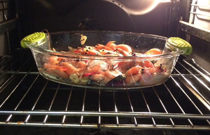 - Для начала продукты следует разморозить и слить лишнюю воду. Затем взять рукав для запекания, выложить туда сырых членистоногих.