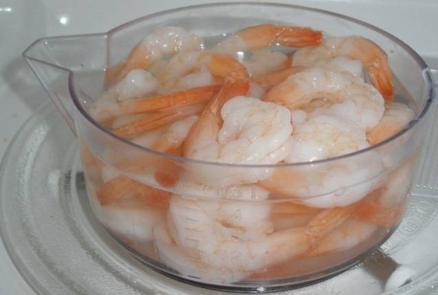 Еще один способ размораживания – в микроволновке. Нужно переложить креветки в специальную посуду для СВЧ и поставить в микроволновую печь, выбрав режим разморозки и выставив размер порции. Во время размораживания желательно периодически останавливать работу прибора и перемешивать морепродукты, т.к. микроволны разогревают неравномерно.